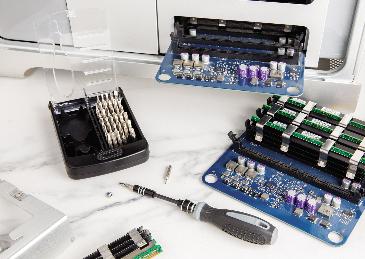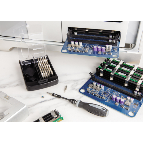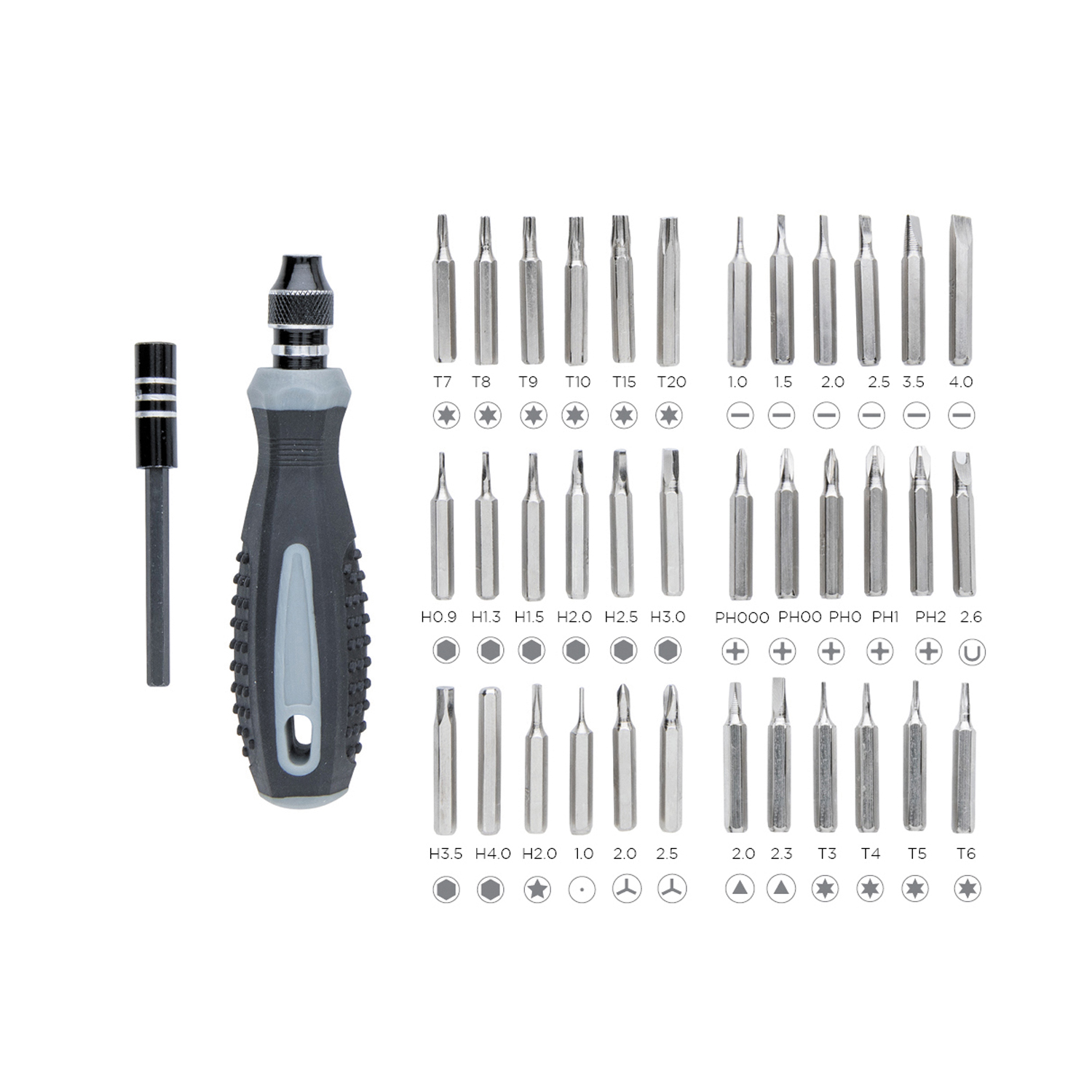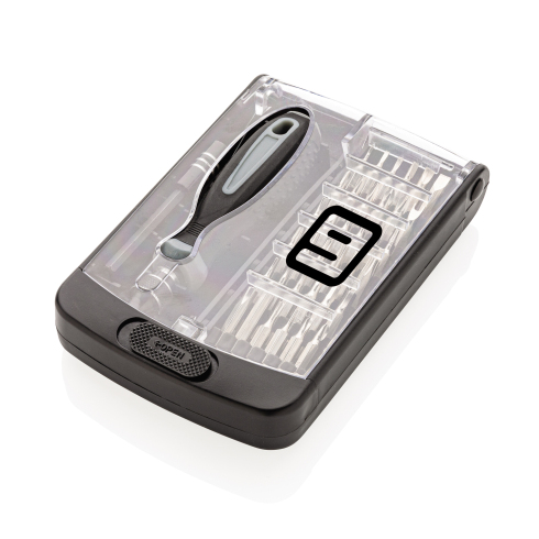 Набор инструментов из 38 предметов с держателем бит из полипропилена. Биты из углеродистой стали. Кейс для хранения с прозрачным верхом из ABS-пластика.