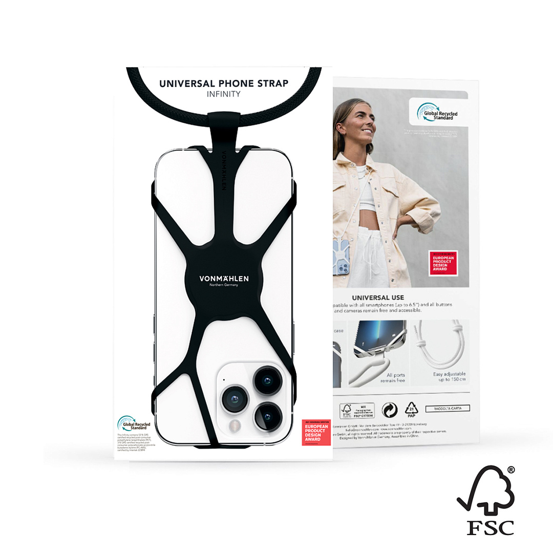 Универсальный ремешок-держатель VONMAHLEN Infinity совместим со всеми популярными моделями смартфонов. Его можно прикрепить всего за несколько секунд даже поверх чехла. Infinity сочетает элегантность и функциональность: интеллектуальный дизайн и полностью регулируемый нейлоновый шнур делают его по-настоящему идеальным аксессуаром. Гибкий силикон гарантирует, что ваш телефон всегда надежно закреплен. Ремешок-держатель не ограничивает использование кнопок или функций на телефоне.