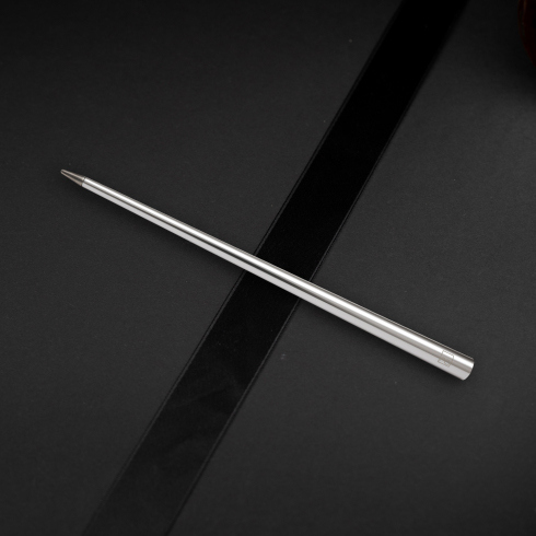 Forever Prima SILVER - яркая дизайнерская ручка удлиненной конической формы, отмеченная GranDesign Etico International Award. Серебристый корпус из анодированного алюминия венчает наконечник Ethergraf, который изготовлен из сплава металлов по запатентованной технологии. Наконечник не содержит свинец и алюминий, производится вручную итальянскими мастерами и практически не расходуется за десятилетия использования. При соприкосновении с поверхностью бумаги, происходит химическая реакция и наконечник оставляет серебристый след, который напоминает цвет графитового карандаша, но обладает большей стойкостью. Идеально пишет на каменной бумаге. Вес ручки всего 20 гр при длине 18 см. При гравировке вскрывается белым цветом. Ручка поставляется в черном картонном тубусе диаметром 4,5 см, длиной 19 см.