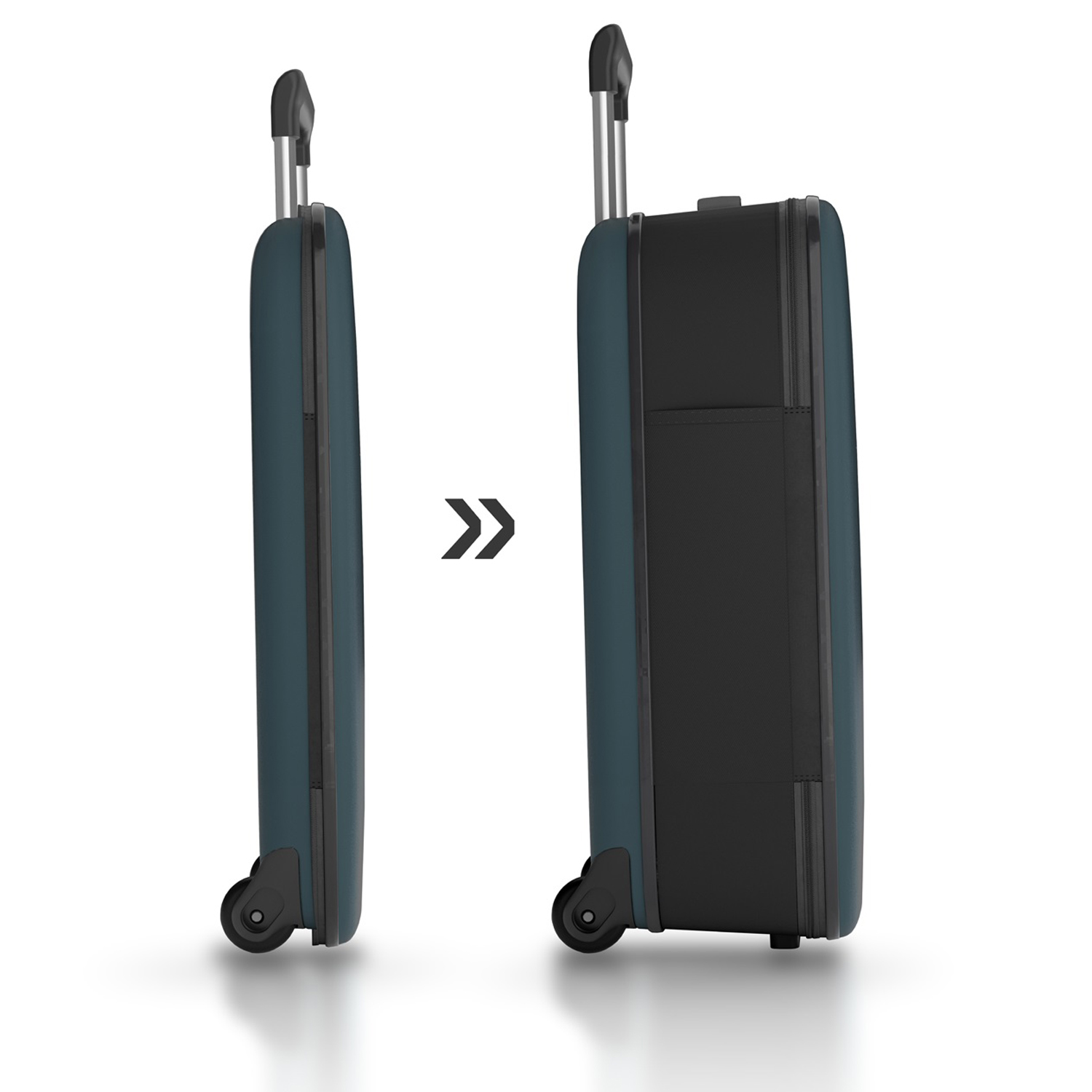 Складной легкий чемодан Rollink Vega II сине-зеленого цвета Deep Lagoon. Размер 55х40х20 см. В сложенном виде толщина составляет 5 см, с колёсами 8,5 см. Объем 40 л. Вес 2,4 кг. Жесткие стенки сделаны из поликарбоната повышенной ударопрочности. Бока мягкие, из темно-серого плотного полиэстера с высокой водоотталкивающей способностью. Чемодан уверенно стоит вертикально даже в сложенном состоянии. Внутри три откидывающихся жестких клапана на дне и боках чемодана, крепятся липучками и сохраняют форму чемодана в собранном виде. Эластичная Х-образная стяжка для фиксации предметов внутри чемодана. Боковой easy access карман 12х18,5 см на липучке для документов и телефона. Удлиненная надежная выдвижная телескопическая ручка из алюминия с несколькими уровнями фиксации высоты ручки (от пола 88/96/104 см) для людей разного роста и удобная мягкая ручка сверху чемодана, чтобы было удобно нести его в руках. 2 колеса со специальным покрытием и подшипниками для более плавного и бесшумного передвижения. Высококачественная молния черного цвета. В комплект входит эластичная стяжка для фиксации чемодана в сложенном состоянии.