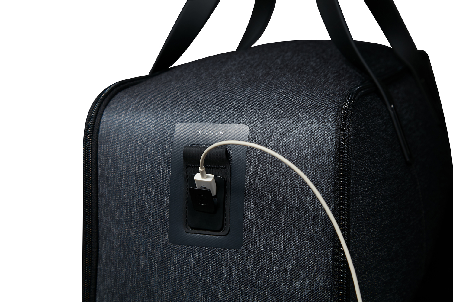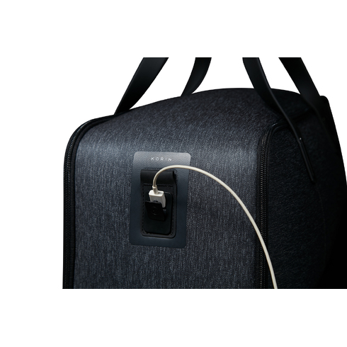 • USB-кабель из внутреннего кармана на молнии 13х18 см соединен с портом на внешней стороне сумки.
