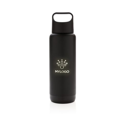 Термос с двойными стенками. Внутренняя стенка выполнена из нержавеющей стали марки 304, внешняя – из прочного пластика ABS. Функция подсветки логотипа с помощью лазерной гравировки. В комплекте 2 батарейки типа CR2032. Объем 500 мл.