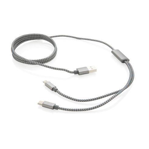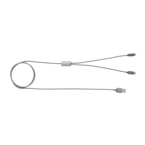 Плетеный кабель превосходного качества 3-в-1. В нем предусмотрены три выхода: Type C и комбинированный разъем - для устройств на платформе iOS и на платформе Android (micro USB). Сам кабель изготовлен из плетеного нейлонового материала, разъемы - из прочного алюминия. Подходит для зарядки устройств. Длина – 120 см.