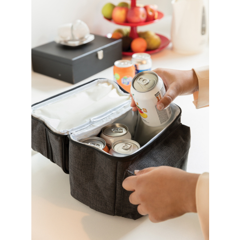 Сумка-холодильник из прочного полиэстера плотностью 600D с удобными ручками для переноски и изолированными отделениями. Просторное верхнее отделение отлично подходит для фруктов, закусок или печенья. В нижнем отделении квадратной формы можно разместить до 6 банок. Передний карман на молнии идеально подходит для небольших аксессуаров, например, для ключей.