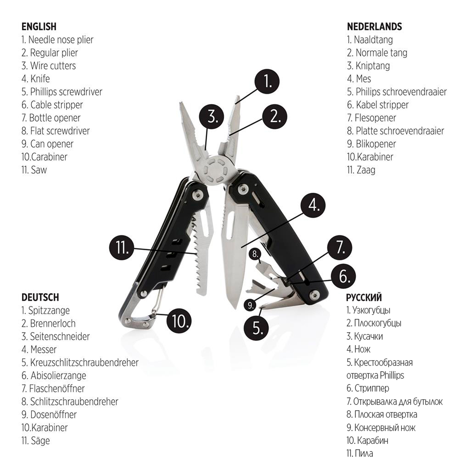Надежный и долговечный мультитул с 11 функциями. Корпус выполнен из алюминия, а инструменты — из нержавеющей стали. В мультитуле предусмотрены: узкогубцы, плоскогубцы, кусачки, нож, крестообразная отвертка Phillips, стриппер, открывалка для бутылок, плоская отвертка, консервный нож, пила и карабин для крепления. Поставляется в фирменной коробке.