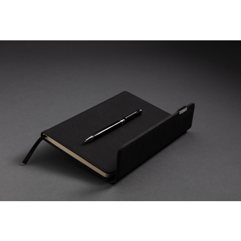 Этот набор идеально подойдет тем, кто хочет выглядеть в офисе утонченно. Обложка блокнота выполнена из текстурированного PU с металлическим лого, внутри 80 листов (160 страниц) линованной кремовой бумаги плотностью 80 г/м². Ручка заправлена немецкими чернилами, способна прочертить линию длиной до 1200 метров. Набор упакован в роскошную подарочную коробку.