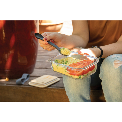 С этим стеклянным контейнером так просто взять с собой любимую домашнюю еду. Благодаря бамбуковой крышке свежесть и польза ингредиентов сохранятся надолго. Контейнер изготовлен из высококачественного боросиликатного стекла, поэтому с легкостью выдерживает большие перепады температуры. В комплекте есть универсальный столовый прибор с 3 функциями: ложки, вилки и ножа.
